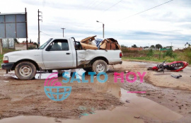 Un joven tuvo que ser trasladado al hospital Municipal tras un choque ocurrido en el acceso principal al barrio Valacco. Tal fue el impacto que ambos vehículos resultaron con importantes daños. Ocurrió cerca de las 12:00 horas de este miércoles 12, en calle Chaco entre Dr. Antonio Montes y Palmeiro cuando una camioneta Ford Ranger que salía desde una calle interna hacia el barrio 34 Viviendas, fue impactada en su lateral izquierdo por una moto Corven que circulaba por Chaco en sentido a la avenida Hipólito Irigoyen. El conductor del rodado mayor dijo a Salto Hoy que el motociclista "venía muy fuerte". Y explicó: "Capaz y no me vio por los pastizales". Violento impacto. Vecinos piden reductores de velocidad. foto: Salto Hoy (HoySaltoOficial) En minutos, una ambulancia del SAME llegó al lugar y trasladó al conductor de la moto al Hospital, donde los médicos constataron que las lesiones no revestían gravedad. «El problema es que todos pasan a la velocidad que quieren. Faltan reductores y encima la calle Chaco la agarran como si fuese una ruta. Esto viene desde siempre, no de ahora», dijo una vecina a este sitio.