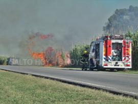 Un camión ardió en llamas en la ruta provincial N° 191 a la altura del limite entre Salto y Arrecifes, mano a nuestra ciudad, y por las fuertes ráfagas de viento, el fuego se propagó hacia un cañaveral. Este hecho desató un incendió forestal incontrolable. Sin bien las causas por las que el vehículo tomó fuego todavía se deconocen, gran cantidad de autos y camiones se vieron afectados al no poder avanzar hacia sus destinos, ya que la situación obligó a la Policía y a Tránsito a tener que interrumpir la circulación vehícular en ambos sentidos. Hay casi dos kilómetros de cola. El camión que originó el incidente es propiedad de una empresa de Junín, y según su conductor, se encontraba trabajando en la zona. El hecho comenzó antes de las 15 y pese a estar dentro del Partido de Salto, los primeros en llegar al lugar fueron los Bomberos y la Patrulla Urbana de Arrecifes; minutos después llegaron los servicios de nuestra ciuadad que rápidamente se pusieron a trabajar codo a codo para extinguir el fuego. Son cuatro las dotaciones de bomberos que trabajan en el lugar.